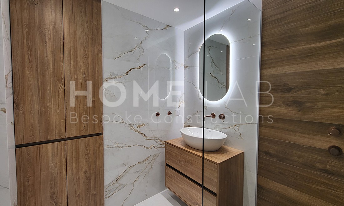 WC και χώρο ξεκούρασης με μπάνιο.Κυριαρχεί το ξύλο και τολευκό μάρμαρο με πινελιές οργανικών στοιχείων