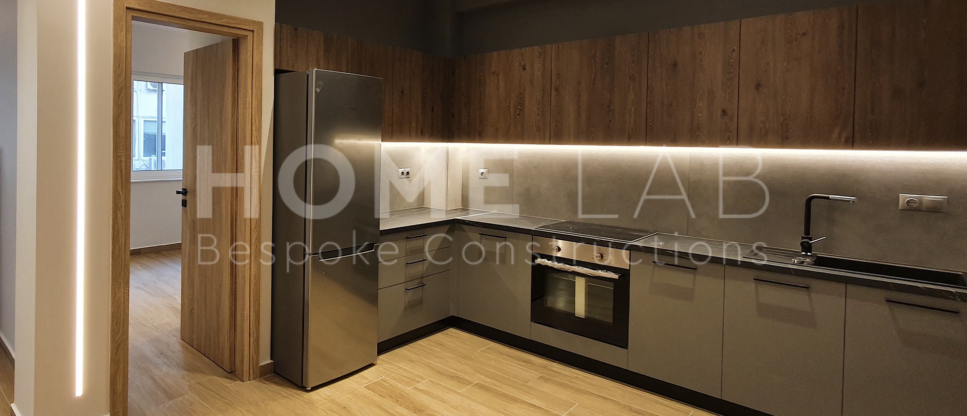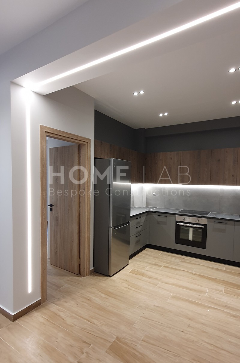 Η χρωματική παλέτα έχει γκρι τόνους στην κουζίνα με το λευκό και το δρυς να κυριαρχούν στους υπόλοιπους χώρους.