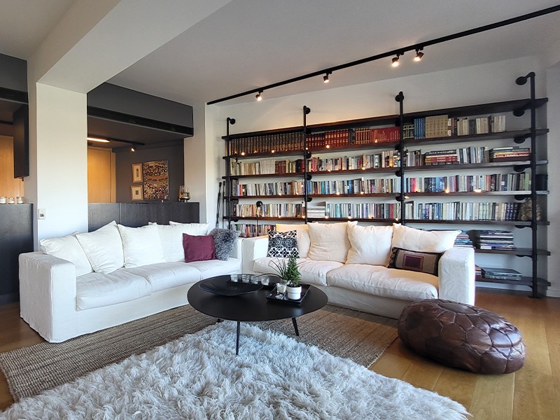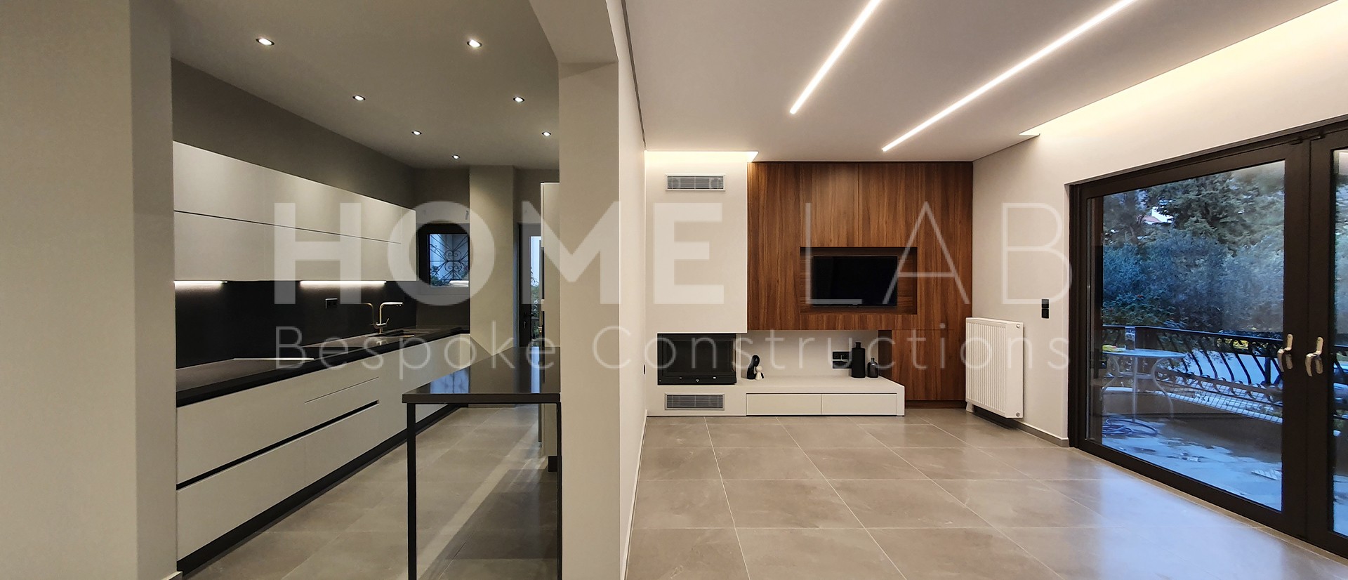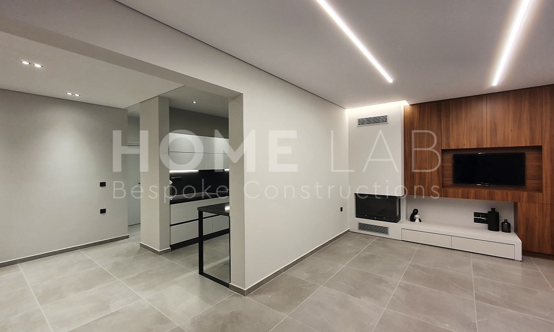 Minimal αισθητική, custom κατασκευές επίπλων, ενεργειακό τζάκι με TV unit και ποιοτικά υλικά κατασκευής.