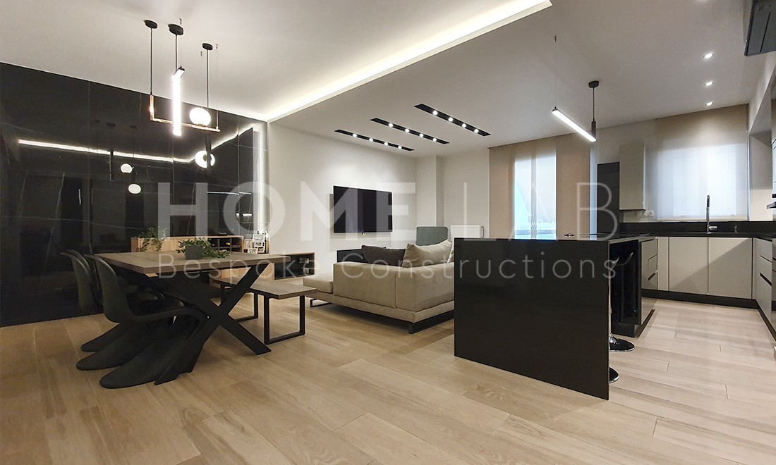 Στη μία βρίσκουμε τον ενιαίο χώρο καθιστικού-κουζίνας με hi-end γυάλινη κουζίνα με